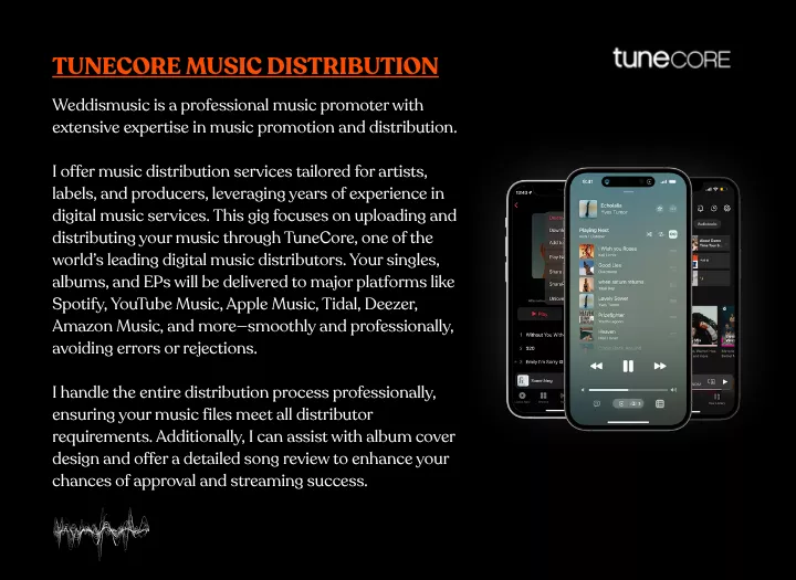 Hi, I’m professional music promoter with extensive experience in music promotion and distribution services for artists, labels, and producers. This gig focuses on uploading and distributing your music through TuneCore, one of the world’s leading digital music distributors.