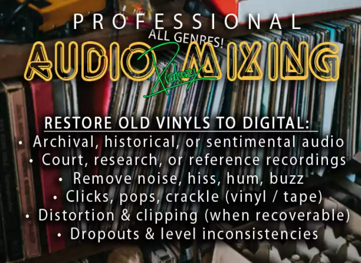 Currently offering remote mixing, editing & audio repair services worldwide. Whether your project is a song, podcast, audiobook, beat, or vocal session, I will deliver you clean, balanced, commercial ready audio that you can drop on streaming platforms like YouTube, SoundCloud, Radio, or you can use for your own purposes :). ALL 100% HUMAN & HAND MADE!