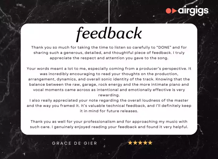 ๐ ๐ก๐ผ๐๐ฒ: This service applies to ๐ผ๐ป๐ฒ ๐๐ฟ๐ฎ๐ฐ๐ธ ๐ผ๐ป๐น๐. If you'd like feedback for an EP or full album (Track-by-track feedback), please send me a message for a custom quote. ๐ฉ